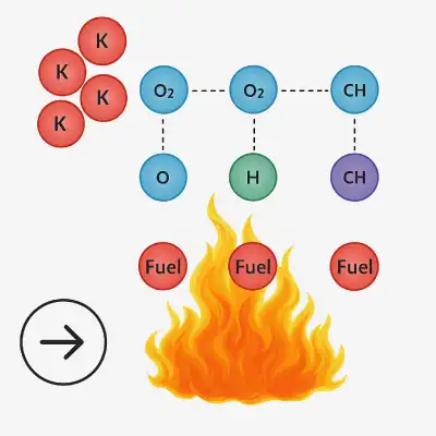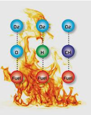 Fire propagation radicals (OH, H, and O) are essential elements in sustaining fire. These reactive species continuously fuel combustion reactions. Condensed Aerosol Generating Fire Suppression Agents primarily act by chemically interfering with these free radicals within the fire zone, thereby disrupting the ongoing chain reaction that maintains the fire.